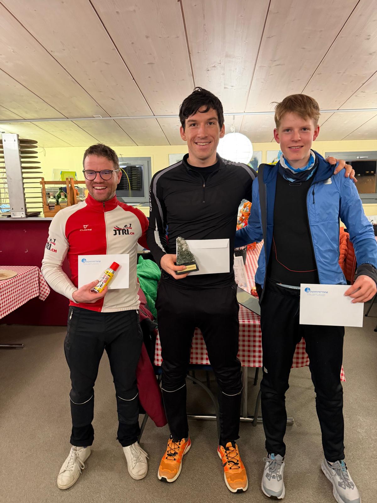 Für die Clubmeisterschaft wurden nach diesen Resultaten die Handicaps nochmals ein wenig angepasst und es entwickelte sich ein sehr spannendes Rennen. Die Verhältnisse auf der Nachtloipe waren perfekt und schnell. Das Podest wurde auf dem letzten Kilometer entschieden und Leon gewann ganz knapp vor Luca und Andy. Die Top 10, davon 8 JTRIs, kamen innerhalb von 2 Minuten ins Ziel. Auch bei der effektiv gelaufenen Netto-Zeit konnte Leon mit 30 Minuten für die ca. 11.5 km eine fabelhafte Zeit vorweisen. Luca verlor fast 2 Minuten, Kaspar fast 4 Minuten auf den Sieger. Zu erwähnen gilt es auch die tolle Leistung von unserem Jugendmitglied Kenora, die 2 statt 3 Runden absolvierte und sich vor allen ins Ziel rettete. Die Organisation und Handicaps waren wiederum sehr gelungen, vielen Dank an Kaspar für den Einsatz und dem Sponsor Sportfitting Kälin!